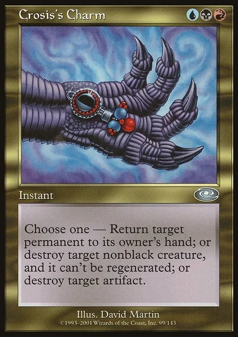 Choose one — • Return target permanent to its owner's hand. • Destroy target nonblack creature. It can't be regenerated. • Destroy target artifact.