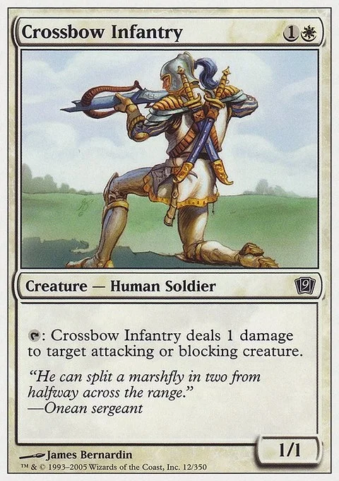 {T}: Crossbow Infantry deals 1 damage to target attacking or blocking creature.