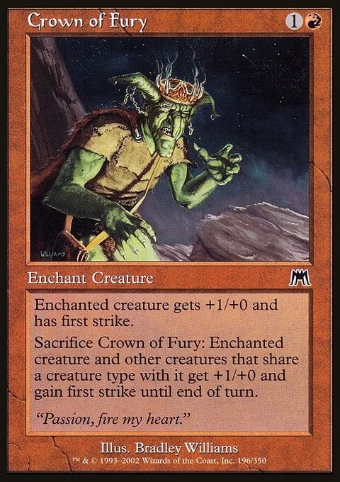 Enchant creature Enchanted creature gets +1/+0 and has first strike. Sacrifice Crown of Fury: Enchanted creature and other creatures that share a creature type with it get +1/+0 and gain first strike until end of turn.