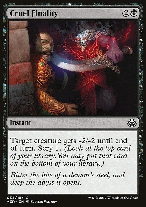 Target creature gets -2/-2 until end of turn. Scry 1. (Look at the top card of your library. You may put that card on the bottom.)