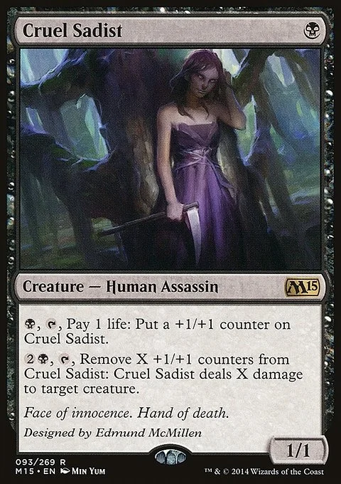 2B, T, Remove X +1/+1 counters from Cruel Sadist: Cruel Sadist deals X damage to target creature.