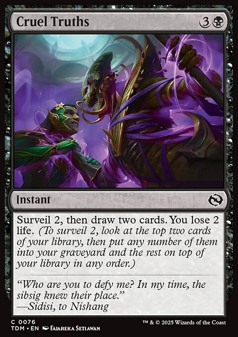 Surveil 2, then draw two cards. You lose 2 life. (To surveil 2, look at the top two cards of your library, then put any number of them into your graveyard and the rest on top of your library in any order.)