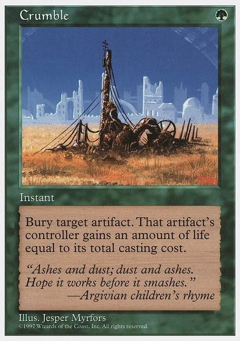 Bury target artifact. That artifact’s controller gains an amount of life equal to its total casting cost.