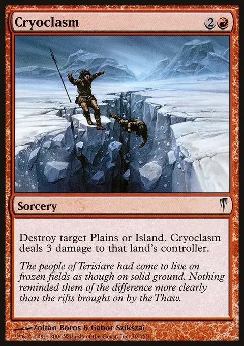 Destroy target Plains or Island. Cryoclasm deals 3 damage to that land's controller.