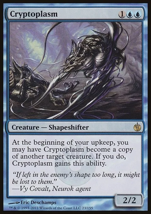 At the beginning of your upkeep, you may have Cryptoplasm become a copy of another target creature, except it has this ability.