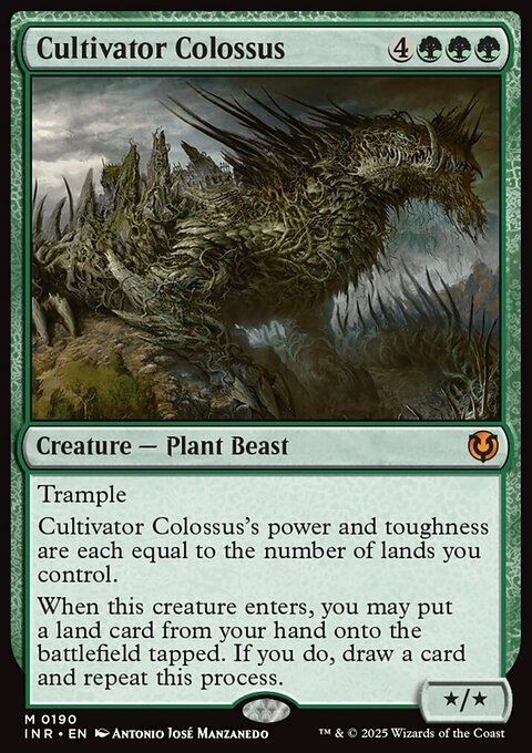 Trample Cultivator Colossus's power and toughness are each equal to the number of lands you control. When this creature enters, you may put a land card from your hand onto the battlefield tapped. If you do, draw a card and repeat this process.