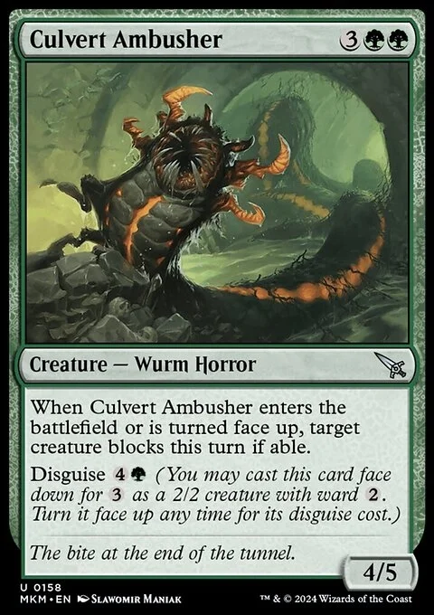 When Culvert Ambusher enters the battlefield or is turned face up, target creature blocks this turn if able. Disguise {4}{G} (You may cast this card face down for {3} as a 2/2 creature with ward {2}. Turn it face up any time for its disguise cost.)