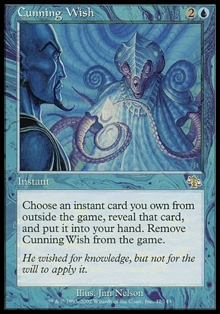 Choose an instant you own from outside the game, reveal that card, and put it into your hand. Remove Cunning Wish from the game.