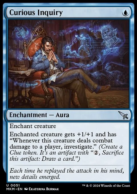 Enchant creature Enchanted creature gets +1/+1 and has "Whenever this creature deals combat damage to a player, investigate." (Create a Clue token. It's an artifact with "{2}, Sacrifice this artifact: Draw a card.")