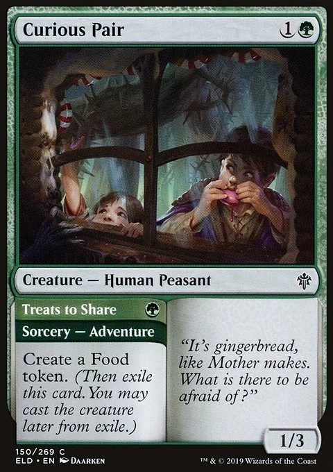Curious Pair Treats to Share Create a Food token. (Then exile this card. You may cast the creature later from exile. A Food token is an artifact with "{2}, {T}, Sacrifice this token: You gain 3 life.")