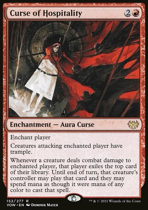 Enchant player Creatures attacking enchanted player have trample. Whenever a creature deals combat damage to enchanted player, that player exiles the top card of their library. Until end of turn, that creature's controller may play that card and they may spend mana as though it were mana of any color to cast that spell.