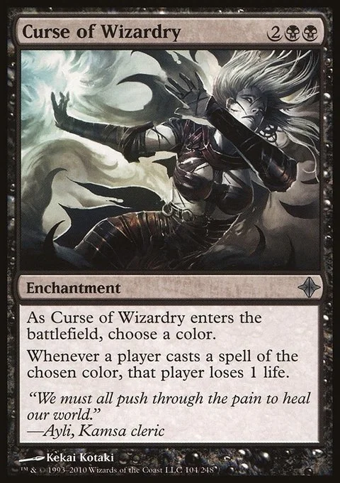 As Curse of Wizardry enters the battlefield, choose a color. Whenever a player casts a spell of the chosen color, that player loses 1 life.