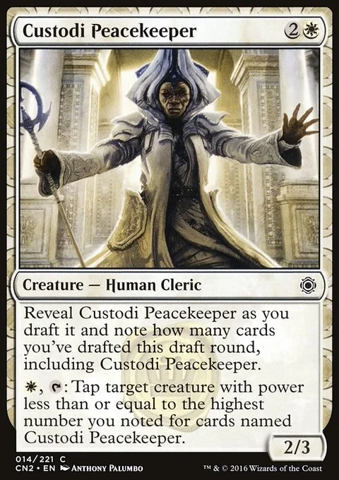 Reveal this card as you draft it and note how many cards you've drafted this draft round, including this card. {W}, {T}: Tap target creature with power less than or equal to the highest number you noted for cards named Custodi Peacekeeper.