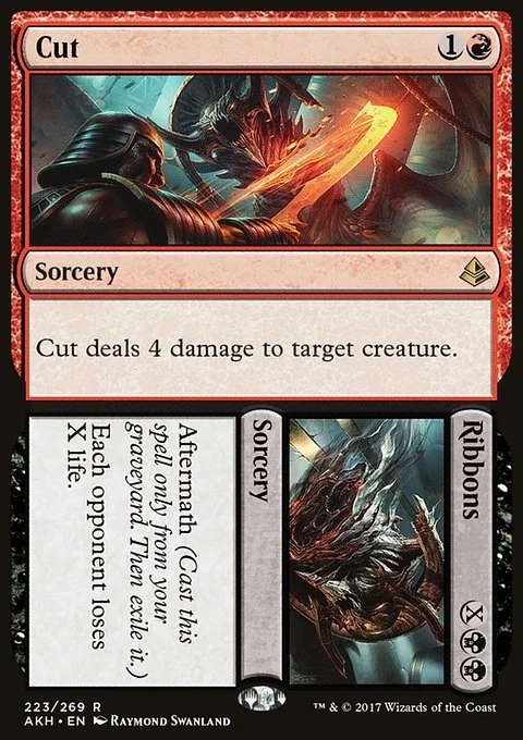 Cut Cut deals 4 damage to target creature. Ribbons Aftermath (Cast this spell only from your graveyard. Then exile it.) Each opponent loses X life.