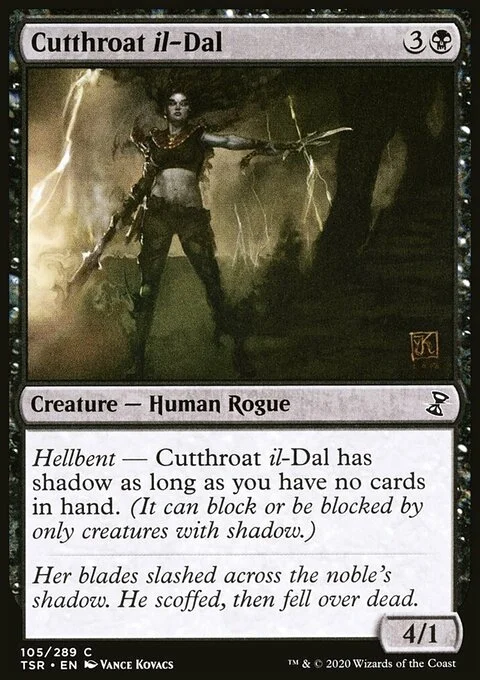 Hellbent — Cutthroat il-Dal has shadow as long as you have no cards in hand. (It can block or be blocked by only creatures with shadow.)