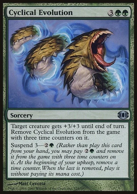 Target creature gets +3/+3 until end of turn. Remove Cyclical Evolution from the game with three time counters on it.