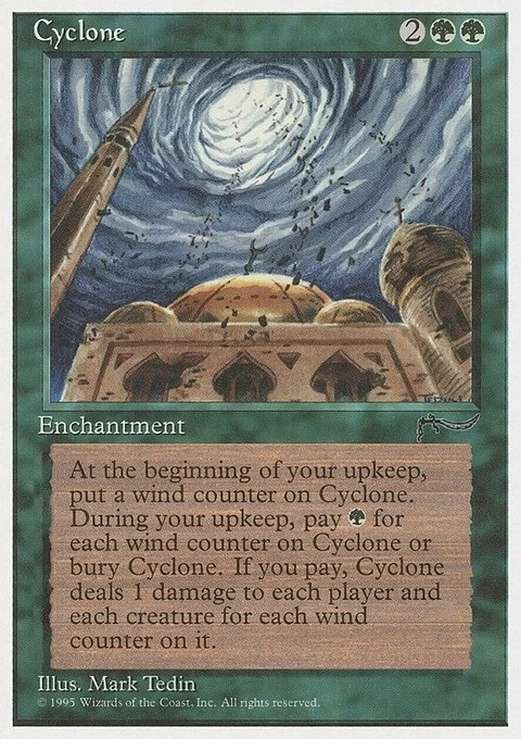 At the beginning of your upkeep, put a wind counter on Cyclone. During your upkeep, pay G for each wind counter on Cyclone or bury Cyclone. If you pay, Cyclone deals 1 damage to each player and each creature for each wind counter on it.
