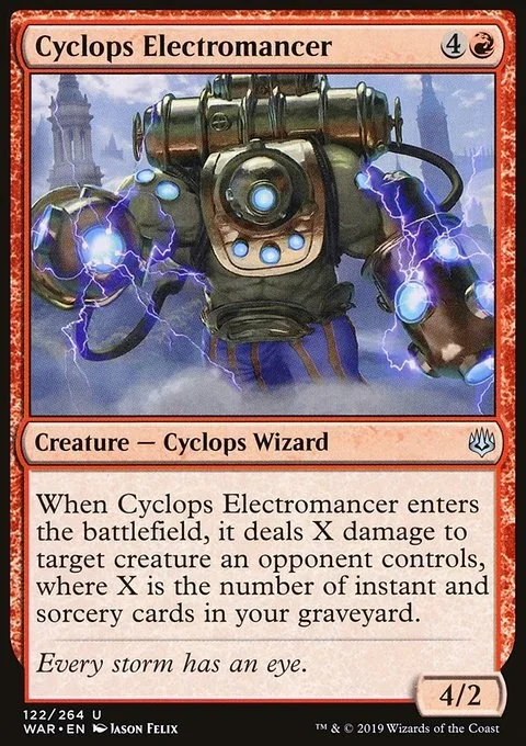 When Cyclops Electromancer enters the battlefield, it deals X damage to target creature an opponent controls, where X is the number of instant and sorcery cards in your graveyard.