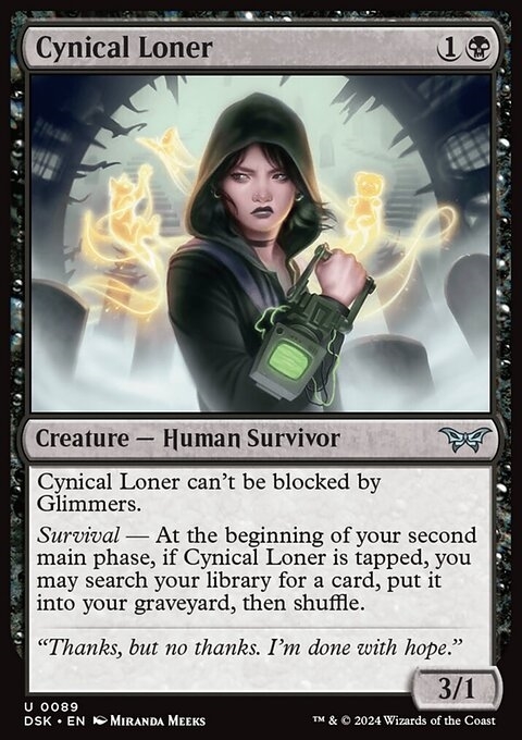 Cynical Loner can't be blocked by Glimmers. Survival — At the beginning of your second main phase, if Cynical Loner is tapped, you may search your library for a card, put it into your graveyard, then shuffle.