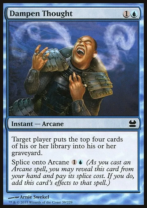 Target player puts the top four cards of their library into their graveyard. Splice onto Arcane {1}{U} (As you cast an Arcane spell, you may reveal this card from your hand and pay its splice cost. If you do, add this card's effects to that spell.)