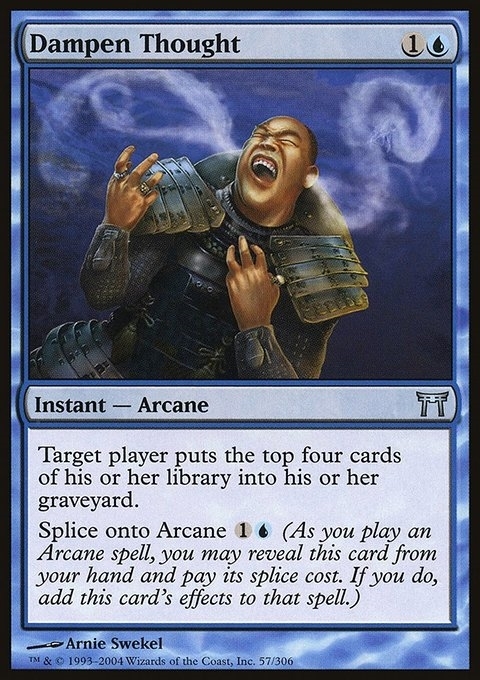 Target player mills four cards. Splice onto Arcane {1}{U} (As you cast an Arcane spell, you may reveal this card from your hand and pay its splice cost. If you do, add this card's effects to that spell.)
