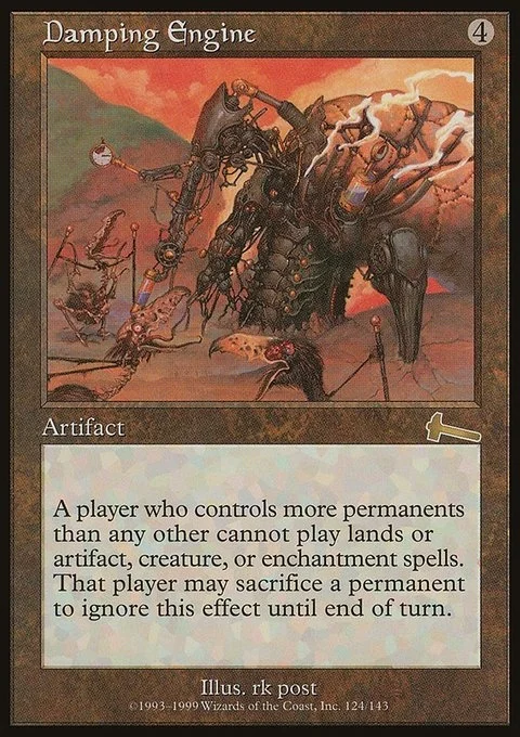A player who controls more permanents than any other cannot play lands or artifact, creature, or enchantment spells. That player may sacrifice a permanent to ignore this effect until end of turn.