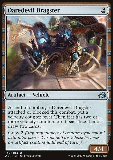 At end of combat, if Daredevil Dragster attacked or blocked this combat, put a velocity counter on it. Then if it has two or more velocity counters on it, sacrifice it and draw two cards.