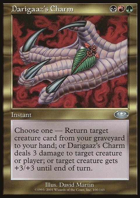 Choose one — • Return target creature card from your graveyard to your hand. • Darigaaz's Charm deals 3 damage to any target. • Target creature gets +3/+3 until end of turn.