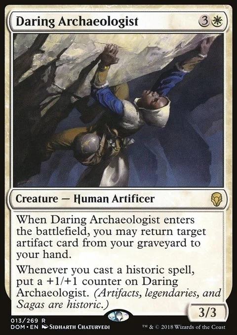 Whenever you cast a historic spell, put a +1/+1 counter on Daring Archaeologist. (Artifacts, legendaries, and Sagas are historic.)
