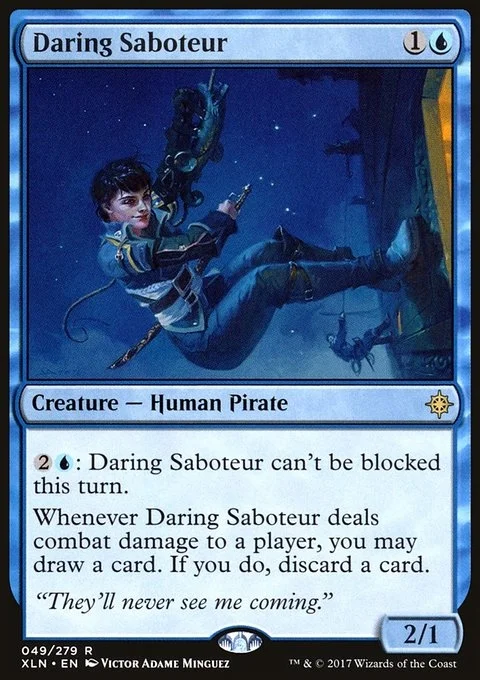 {2}{U}: Daring Saboteur can't be blocked this turn. Whenever Daring Saboteur deals combat damage to a player, you may draw a card. If you do, discard a card.