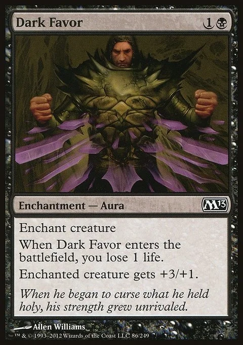 Enchant creature When Dark Favor enters the battlefield, you lose 1 life. Enchanted creature gets +3/+1.