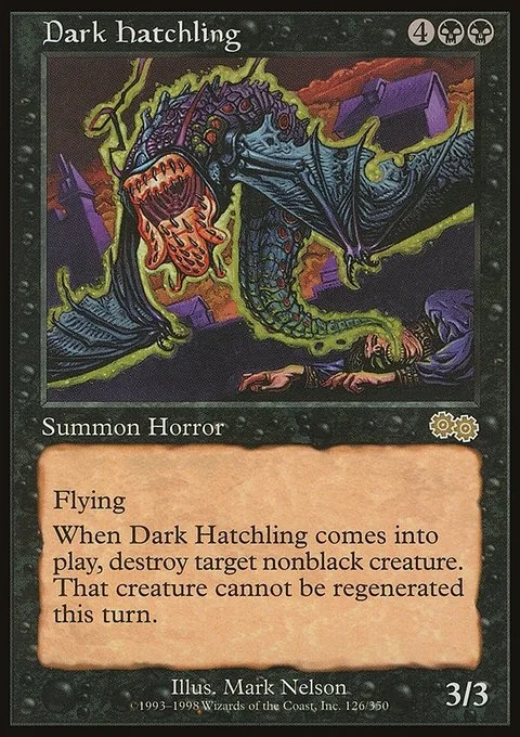 FlyingWhen Dark Hatchling comes into play, destroy target nonblack creature. That creature cannot be regenerated this turn.