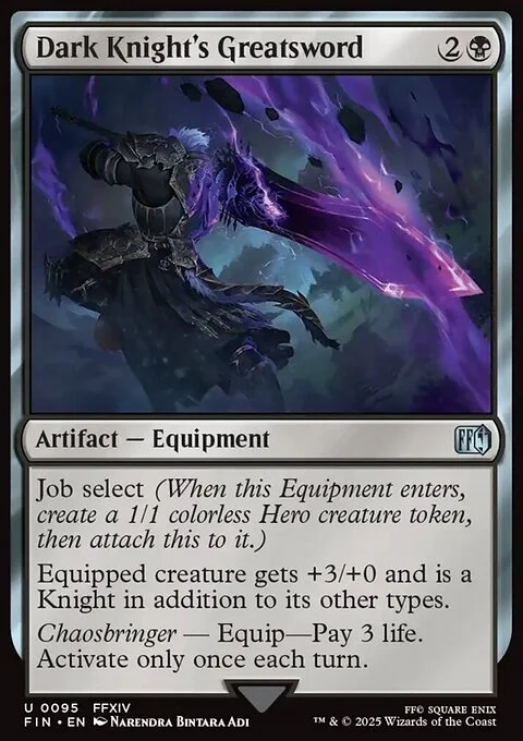 Job select (When this Equipment enters, create a 1/1 colorless Hero creature token, then attach this to it.) Equipped creature gets +3/+0 and is a Knight in addition to its other types. Chaosbringer — Equip—Pay 3 life. Activate only once each turn.