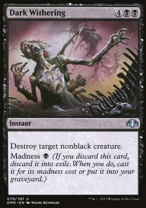 Destroy target nonblack creature. Madness {B} (If you discard this card, discard it into exile. When you do, cast it for its madness cost or put it into your graveyard.)