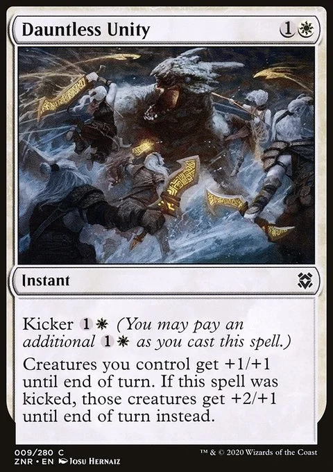 Kicker {1}{W} (You may pay an additional {1}{W} as you cast this spell.) Creatures you control get +1/+1 until end of turn. If this spell was kicked, those creatures get +2/+1 until end of turn instead.