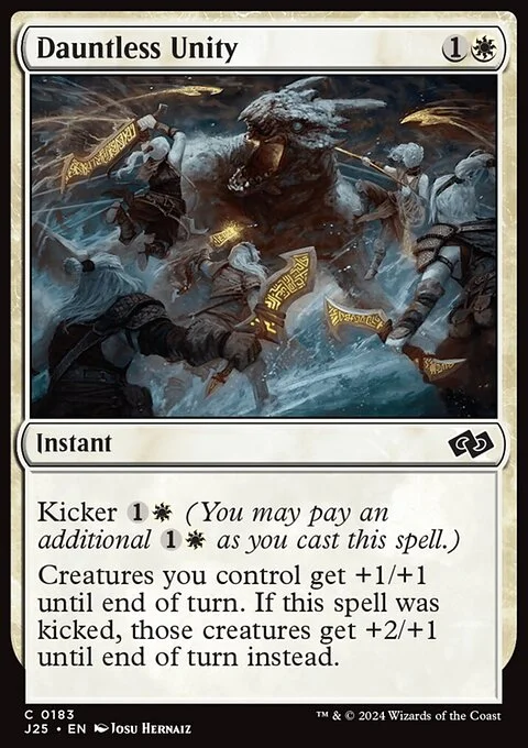 Kicker {1}{W} (You may pay an additional {1}{W} as you cast this spell.) Creatures you control get +1/+1 until end of turn. If this spell was kicked, those creatures get +2/+1 until end of turn instead.