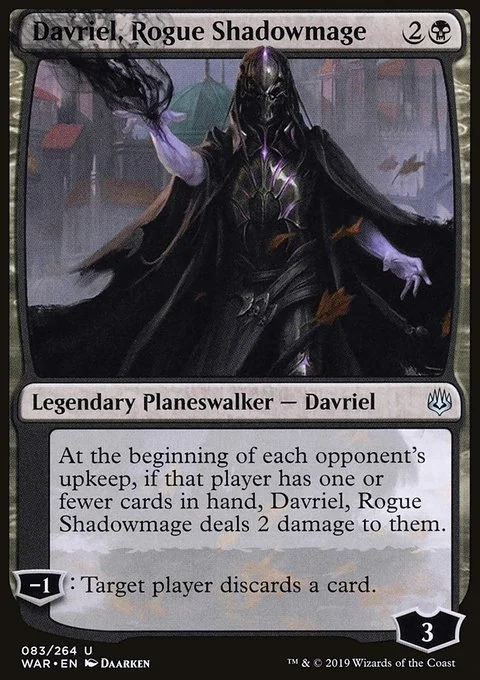 At the beginning of each opponent's upkeep, if that player has one or fewer cards in hand, Davriel, Rogue Shadowmage deals 2 damage to them. -1: Target player discards a card.