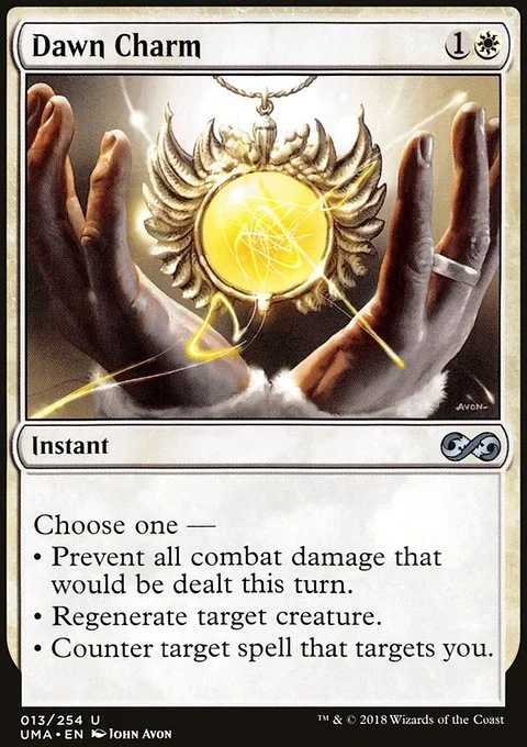 Choose one — • Prevent all combat damage that would be dealt this turn. • Regenerate target creature. • Counter target spell that targets you.