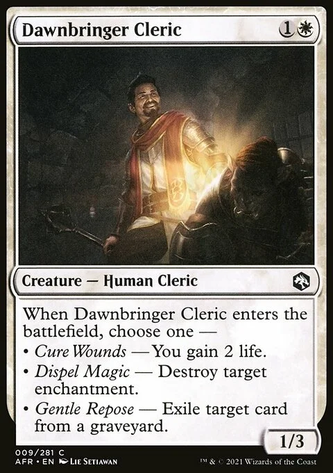 When Dawnbringer Cleric enters the battlefield, choose one — • Cure Wounds — You gain 2 life. • Dispel Magic — Destroy target enchantment. • Gentle Repose — Exile target card from a graveyard.