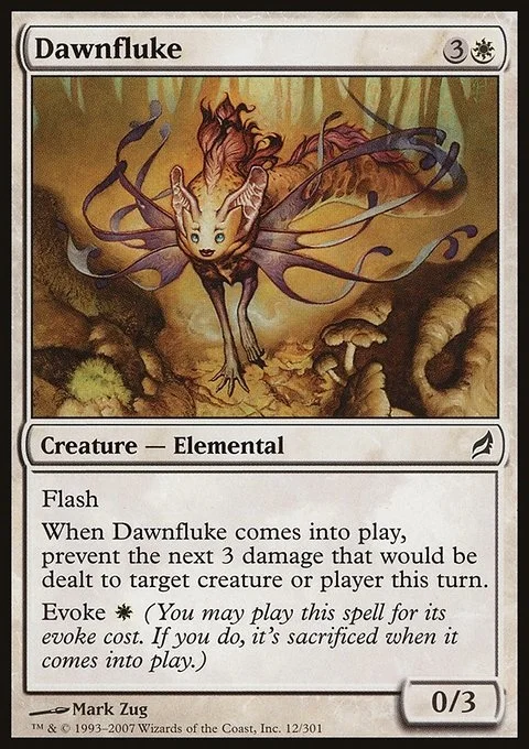 Flash When Dawnfluke enters, prevent the next 3 damage that would be dealt to any target this turn. Evoke {W} (You may cast this spell for its evoke cost. If you do, it's sacrificed when it enters.)