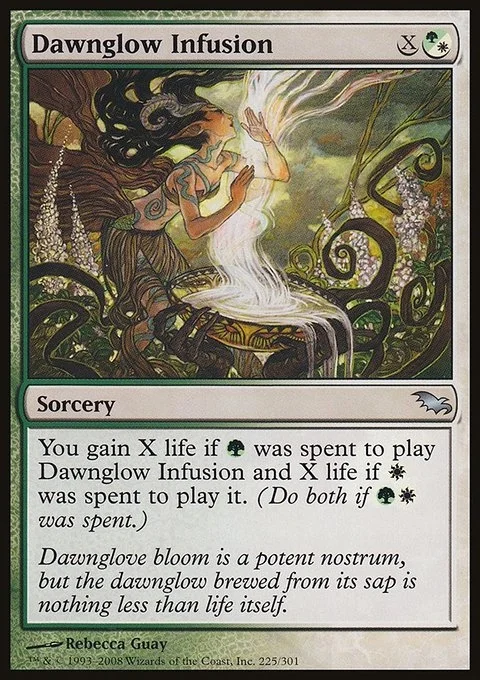 You gain X life if G was spent to play Dawnglow Infusion and X life if W was spent to play it. (Do both if GW was spent.)