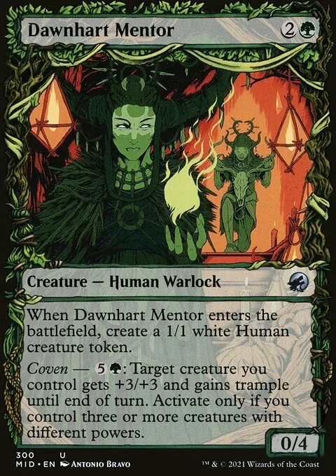 When Dawnhart Mentor enters the battlefield, create a 1/1 white Human creature token. Coven — {5}{G}: Target creature you control gets +3/+3 and gains trample until end of turn. Activate only if you control three or more creatures with different powers.