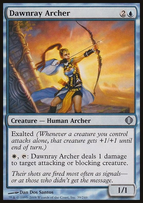 Exalted (Whenever a creature you control attacks alone, that creature gets +1/+1 until end of turn.) {W}, {T}: Dawnray Archer deals 1 damage to target attacking or blocking creature.