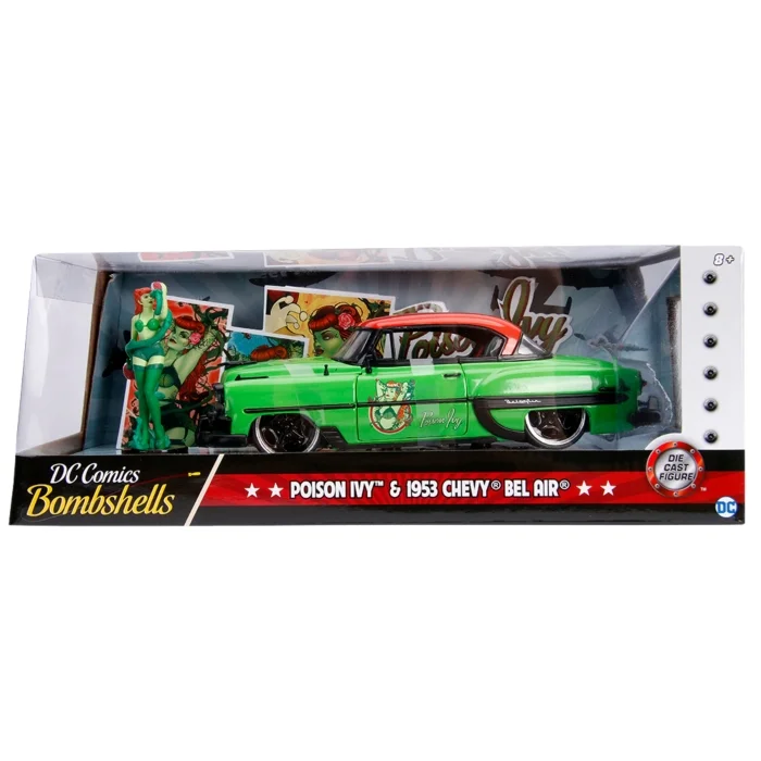 This 1953 Chevy Bel Air takes its pinup styling directly from the temptress DC Bombshell, Poison Ivy! The 1/24th scale vehicle features a die-cast body with a detailed interior and opening doors, hood and trunk, as well as working wheels with rubber tyres. The officially licensed vehicle also comes with a 2.75” Poison Ivy die-cast figure, so you can display the enchanting Gotham City Siren next to her sweet classic ride.