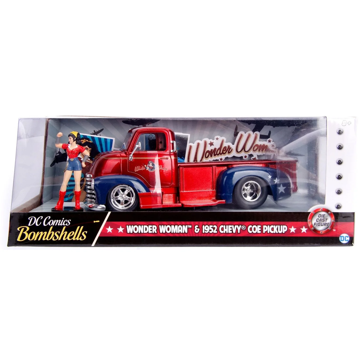 Go back in time with our most popular super-heroines in 1940s-era pinup style along with their sweet classic rides in our DC Bombshells collection. Featuring a die-cast body and rubber tires, this 1:24 scale 1952 Chevy COE pickup is a must have in any collection! Included is a 2.75” Wonder Woman Bombshell die-cast collectible figure. Collect them all today.