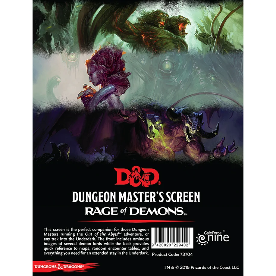 This screen is the perfect companion for those Dungeon Masters running the Out of the Abyss adventure, or any trek into the Underdark. The front includes ominous images of several demon lords while the back provides quick reference to maps, random encounter tables, and everything you need for an extended stay in the Underdark.