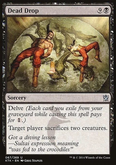 Delve (Each card you exile from your graveyard while casting this spell pays for {1}.) Target player sacrifices two creatures.