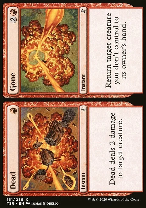 Dead Dead deals 2 damage to target creature. Gone Return target creature you don't control to its owner's hand.
