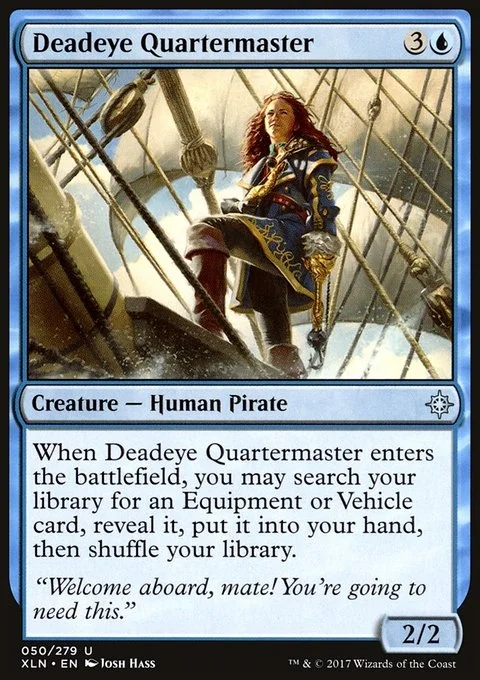 When Deadeye Quartermaster enters the battlefield, you may search your library for an Equipment or Vehicle card, reveal it, put it into your hand, then shuffle.