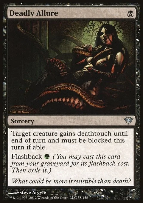Target creature gains deathtouch until end of turn and must be blocked this turn if able. Flashback {G} (You may cast this card from your graveyard for its flashback cost. Then exile it.)